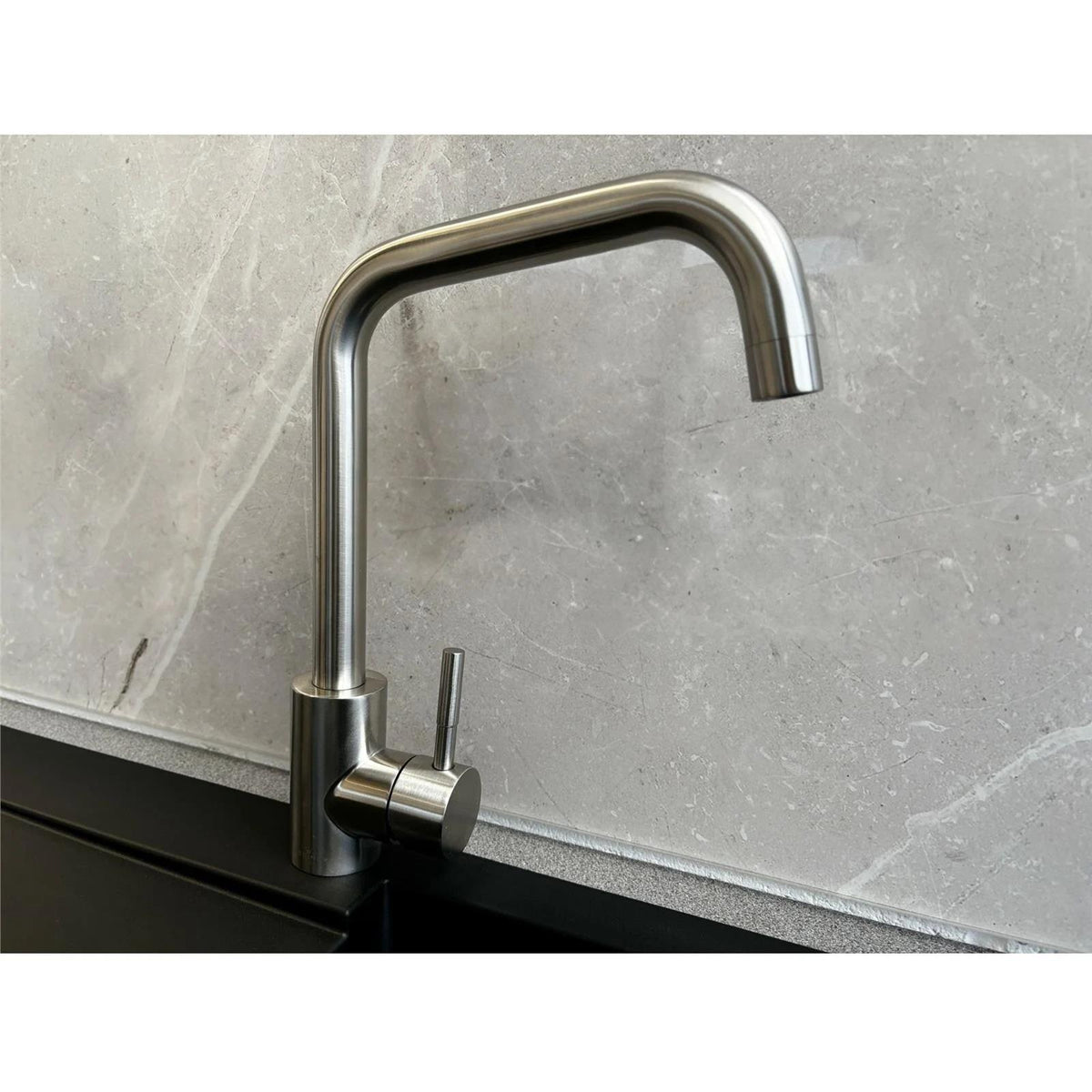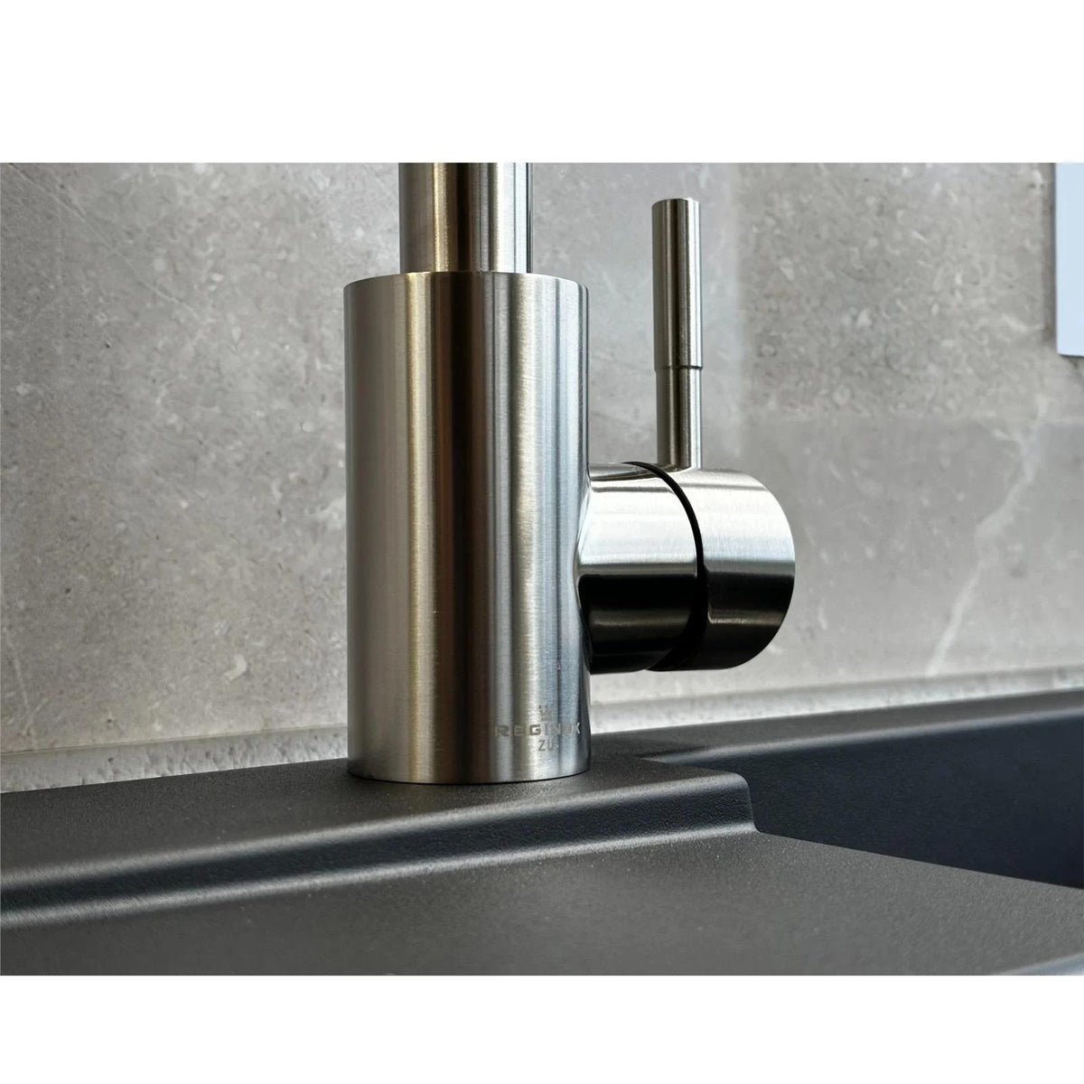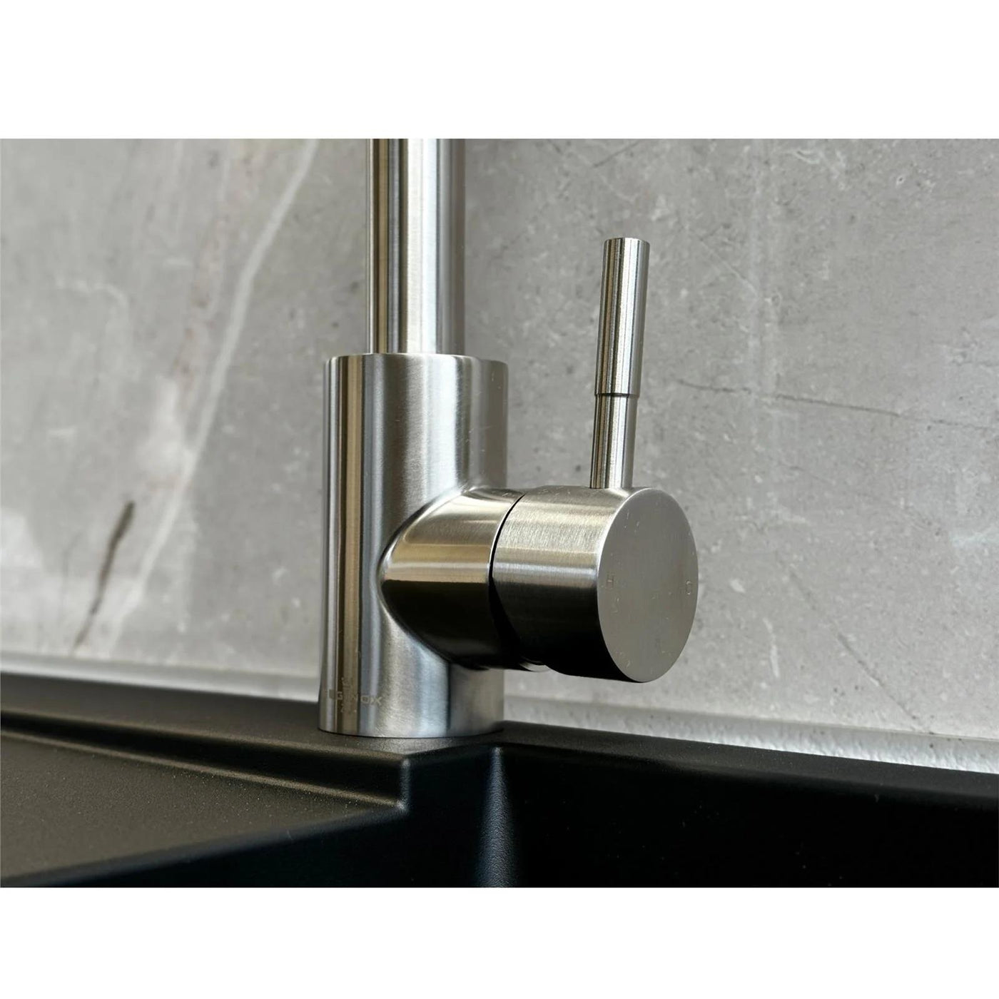 El grifo de cocina monomando Reginox SALINA BN en acabado níquel cepillado ofrece una combinación perfecta de diseño moderno, funcionalidad y durabilidad. Fabricado en latón de alta calidad, cuenta con un cartucho cerámico que garantiza un manejo suave y preciso. Su caño alto con giro de 360° proporciona mayor comodidad para el uso diario.
